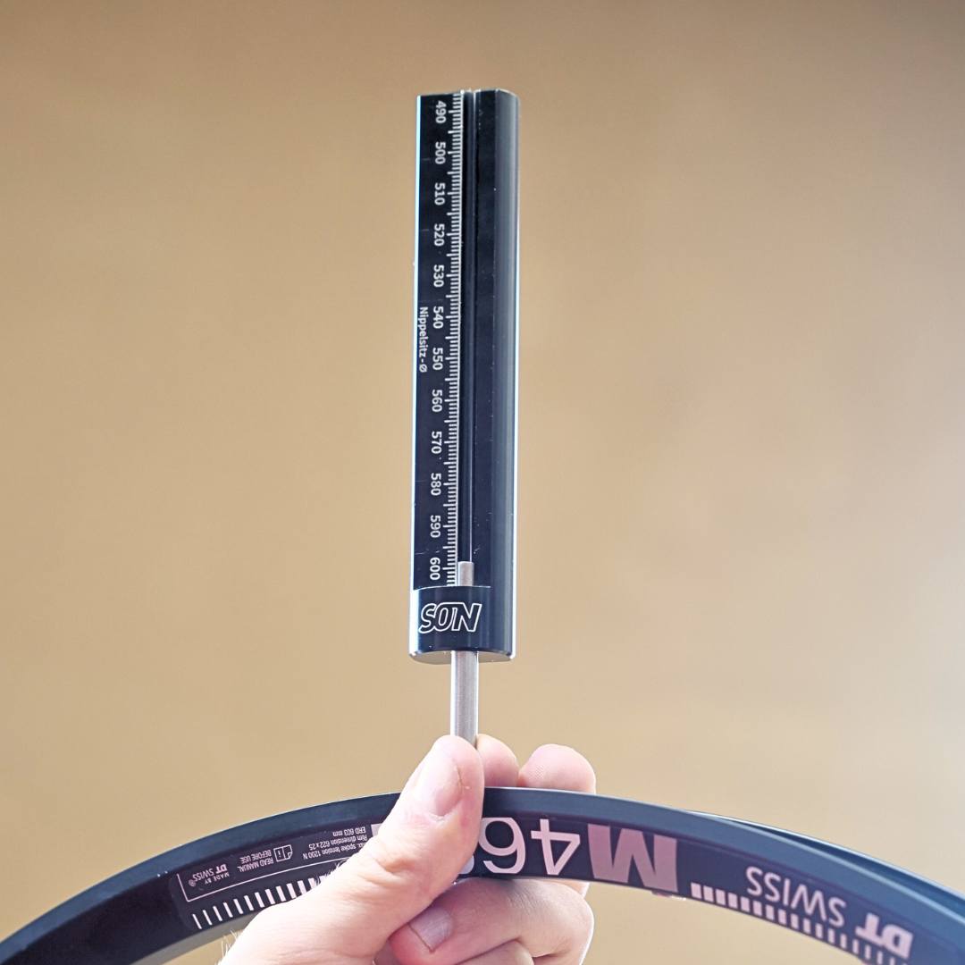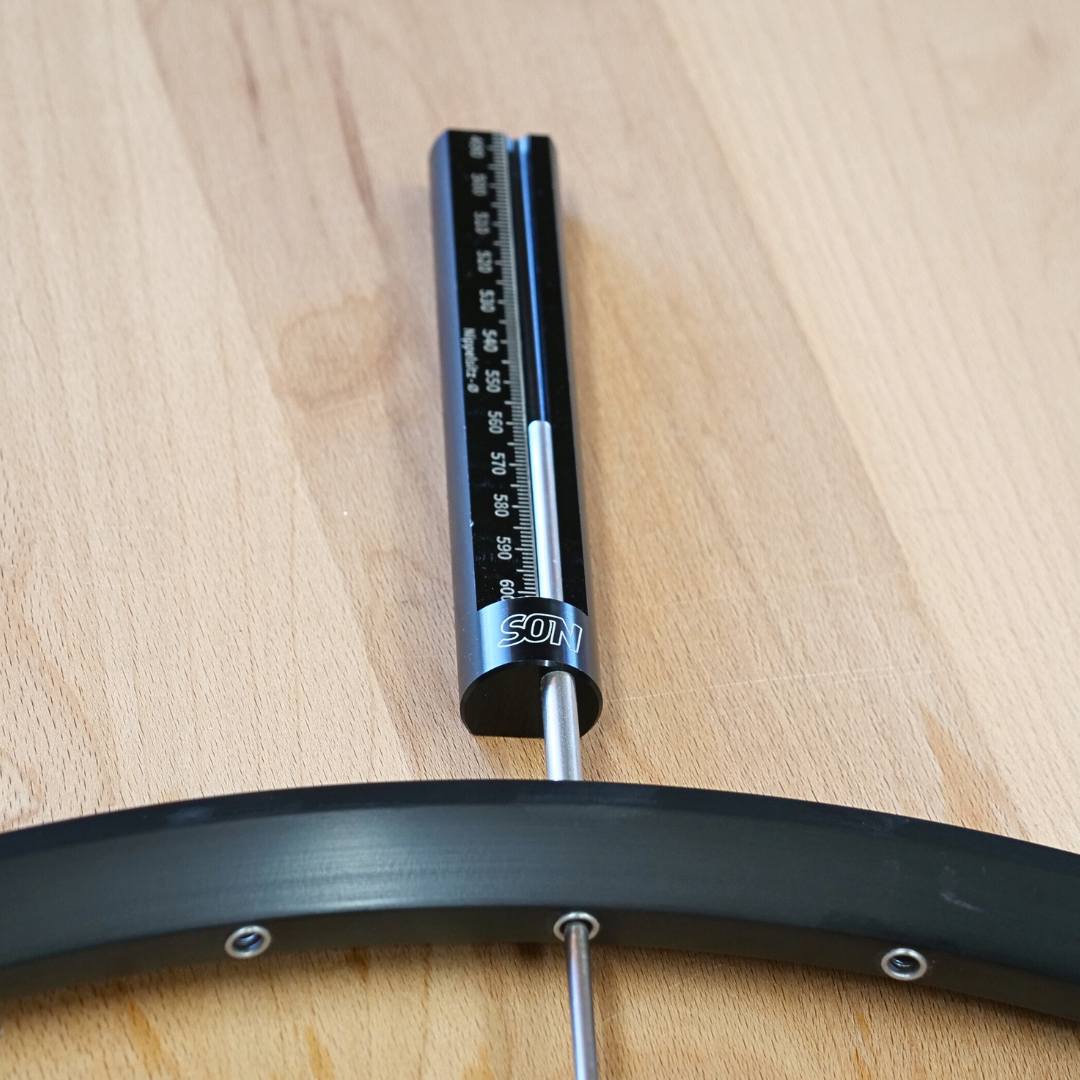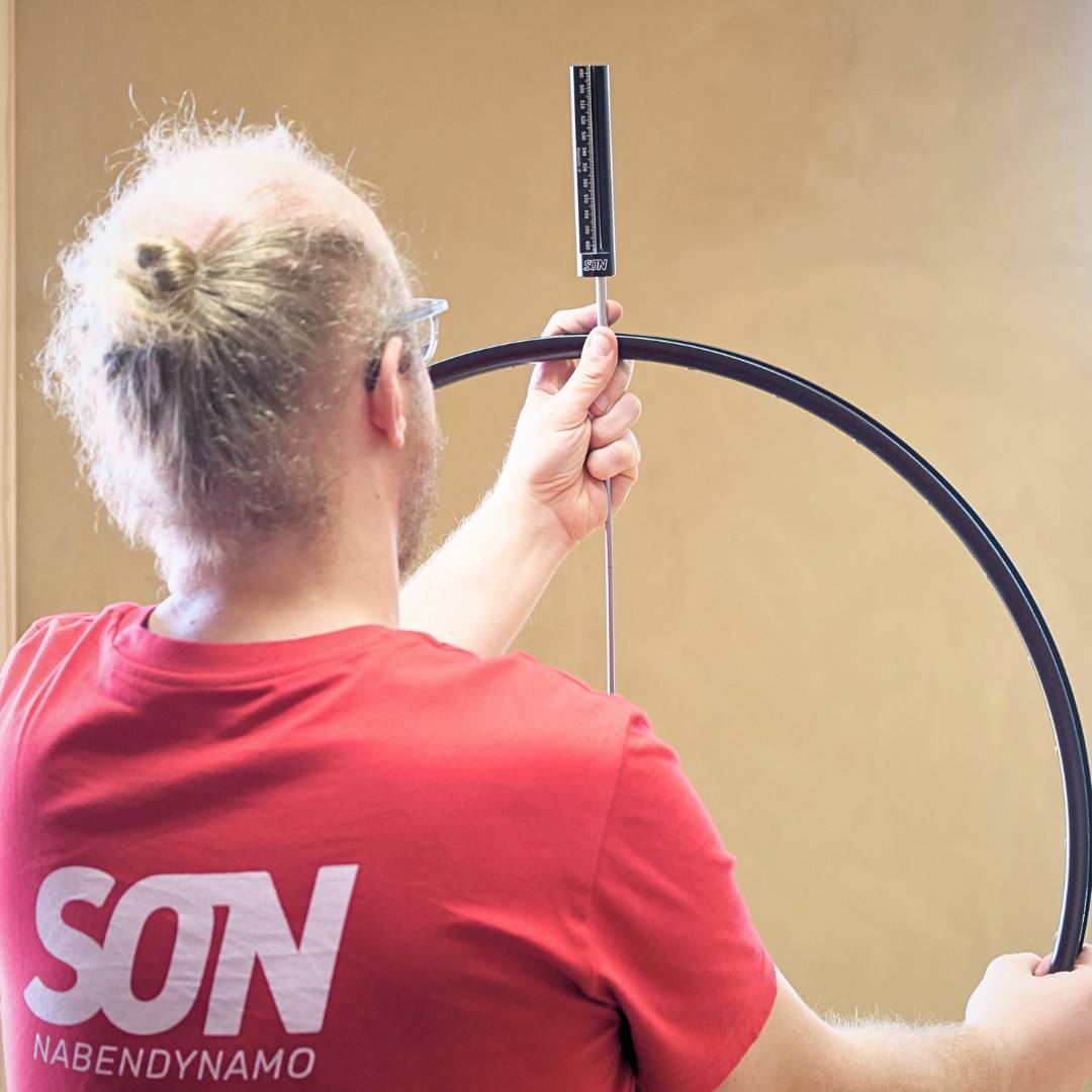 Mit dem SON Nippelsitz-Messgerät lässt sich der Felgendurchmesser (Nippelsitz-Durchmesser) schnell und präzise ermitteln. Den gemessenen Wert einfach in unseren Speichenrechner eingeben, Nabe auswählen und schon erhält man die passende Speichenlänge.